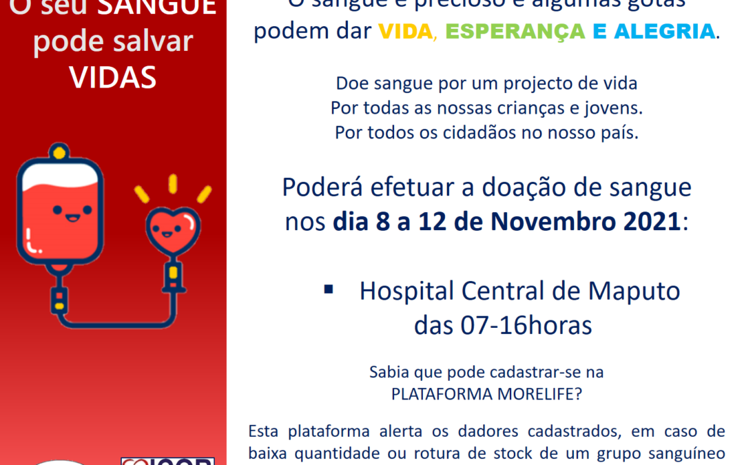O hospital Central de Maputo e em parceria com Instituto de Coração (ICOR) organiza de 08 a 12 de Novembro de 2021 uma campanha de doação de sangue, com vista a ter um stock e satisfazer a procura no âmbito da quadra festiva, por esse motivo apelamos a sua participação de modo ajudar e salvar vidas. Doe sangue e salve vidas.